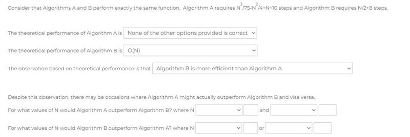 As Algorithm A is made up of a number of polynomial terms, the highest order term, O(N3), cannot be used to determine its theoretical performance. The supplied choice is accurate in stating that Algorithm B's theoretical performance is O(N).