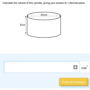pi r^2 h = pi (10^2) 9 cm^3 = ~ 2827 cm^3