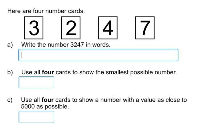 c) To make a number close to 5000, you could use 2, 3, 4, or 7. You use 4 as it is the closest number to 5 (from 5000) without going over. Then you want to put your other numbers in descending order