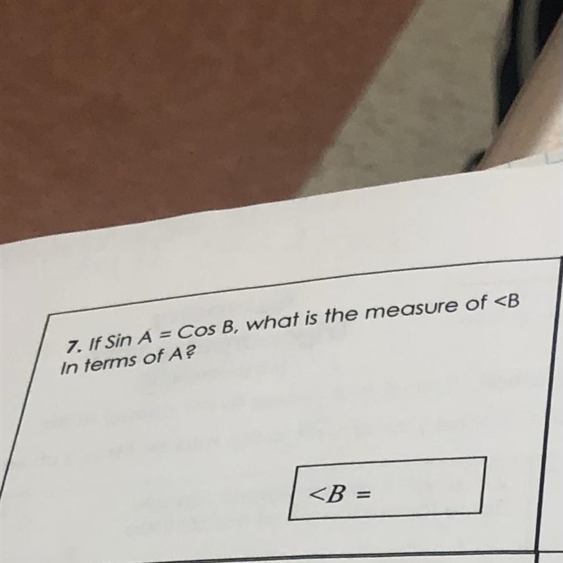 Answer:Thus, the measure of angle B in terms of angle A is B = 90° - A.