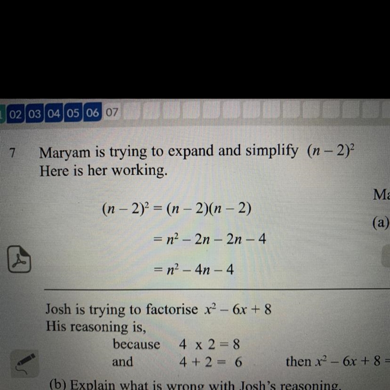 7 Maryam is trying to expand and simplify (n - 2)² Here is her working. A (n-2)² = (n − 2)(n-2) = n²-2n - 2n-4 = n²-4n-4 Maryam's answer is wrong. (a) Find Maryam's mi…