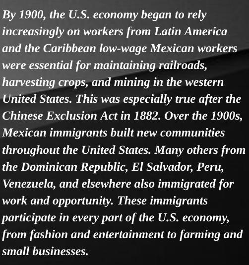 Answer: The passage describes the increasing reliance of the U.S. economy on low-wage workers from Latin America and the Caribbean, especially Mexican workers who played an important role in industries such as railroads, crop harvesting, and mining. The passage notes that Mexican immigrants and other immigrants from countries such as the Dominican Republic, El Salvador, Peru, and Venezuela built new communities in the United States and participated in all sectors of the U.S. economy. The passage highlights the significant contribution of Latin American and Caribbean immigrants to the U.S. economy and society.