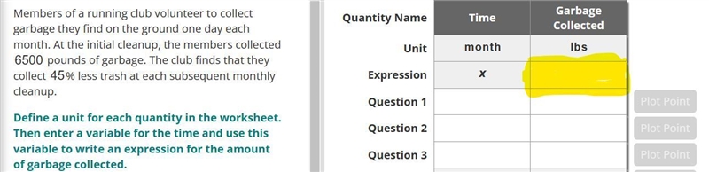 For subsequent cleanups: 45% less garbage collected each month, which means they collect 55% of the previous month's garbage. So, the expression for the amount of garbage collected each month (starting from the second month) would be: