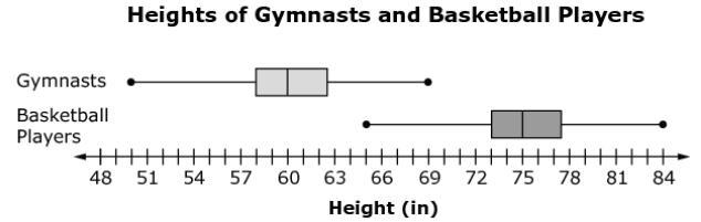 The box plot shows a comparison of the heights of gymnasts and basketball players. The mean absolute deviation for each group is approximately 2.