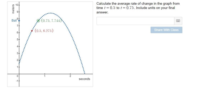 Calculate the average rate of change in the graph from time t=0.5 to t=0.75. Include units on your final answer.