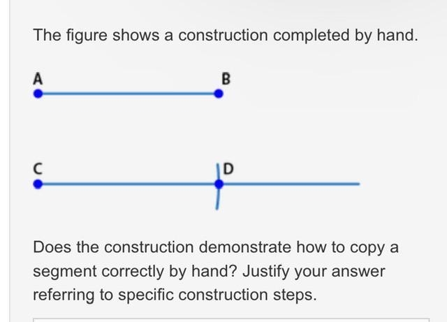 Based on the construction shown above, we can reasonably infer and logically deduce that this construction demonstrates how to correctly copy a line segment by hand because the compass was kept at the same width as segment AB, in order to create the arc from point C, at point D.