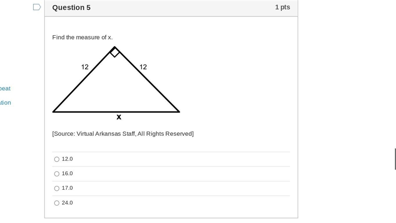 Pythagorean theorem: This theorem states that in a right triangle, the square of the length of the hypotenuse (the side opposite the right angle) is equal to the sum of the squares of the lengths of the other two sides. This can be expressed as a^2 + b^2 = c^2, where a and b are the lengths of the other two sides, and c is the length of the hypotenuse.