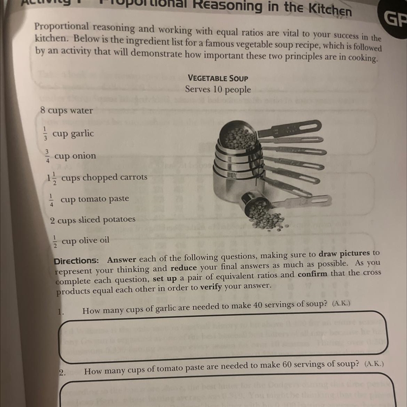 question 1: how many cups of garlic are needed to make 40 servings of soup?