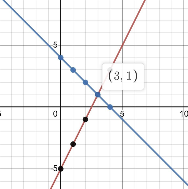The solution of the two equations is where the two lines meet. ( 3, 1)