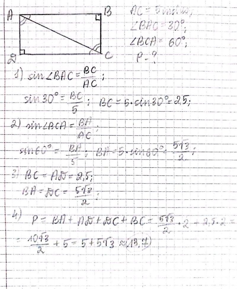 rectangle ABCD with diagonal AC, labeled as measuring 5 inches, angle BAC measuring 30 degrees, angle BCA measuring 60 degrees, angle DCA measuring 30 degrees, and angle DAC measuring 60 degrees. Rounded to the nearest tenth, what is the perimeter of rectangle ABCD?