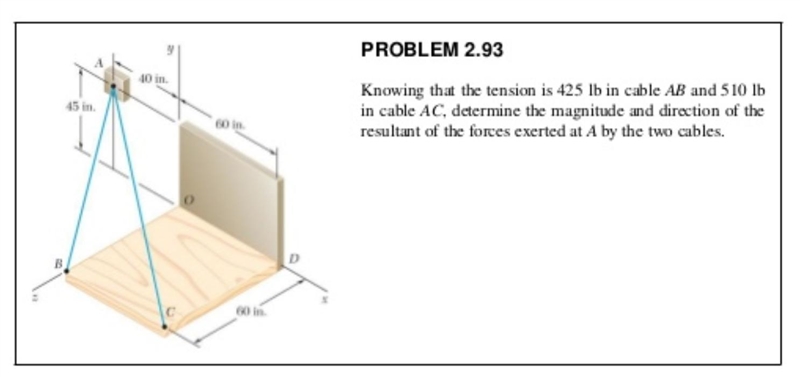 Answer: point A[{-40i + 0j + 45k}], B[{0i + 0j + 60k}], C[{ 60i + 0j + 60k}] from there you can now find the Magnitudes then The unit vectors multiplied by the forces provided 425lb AB and 510lb AC.