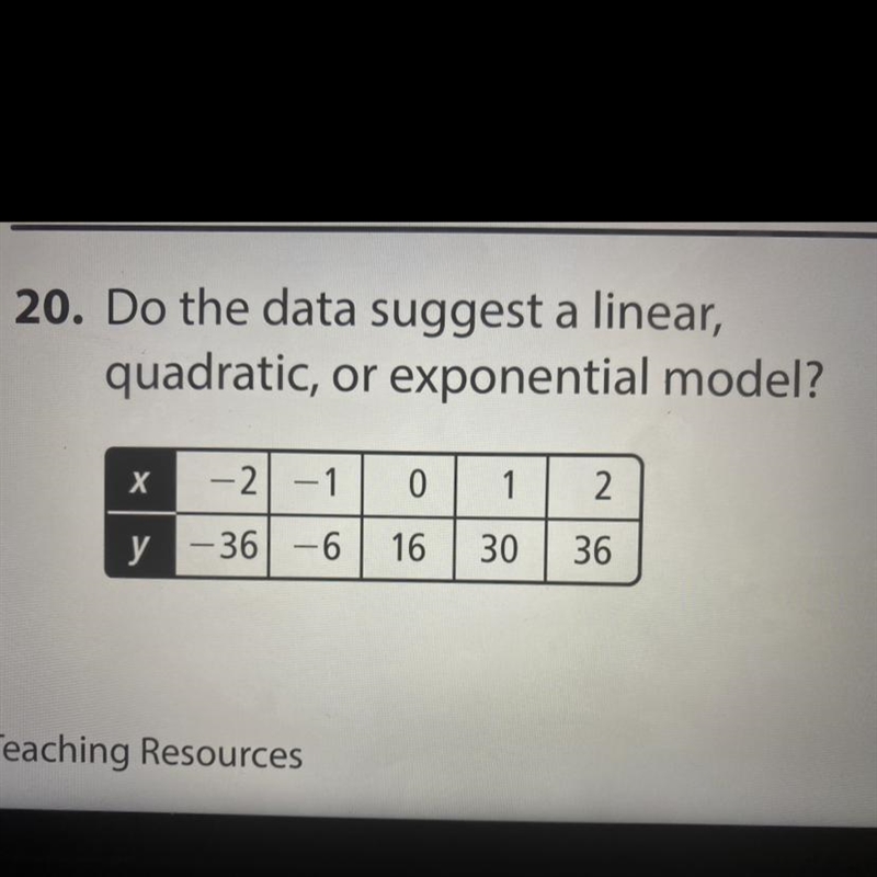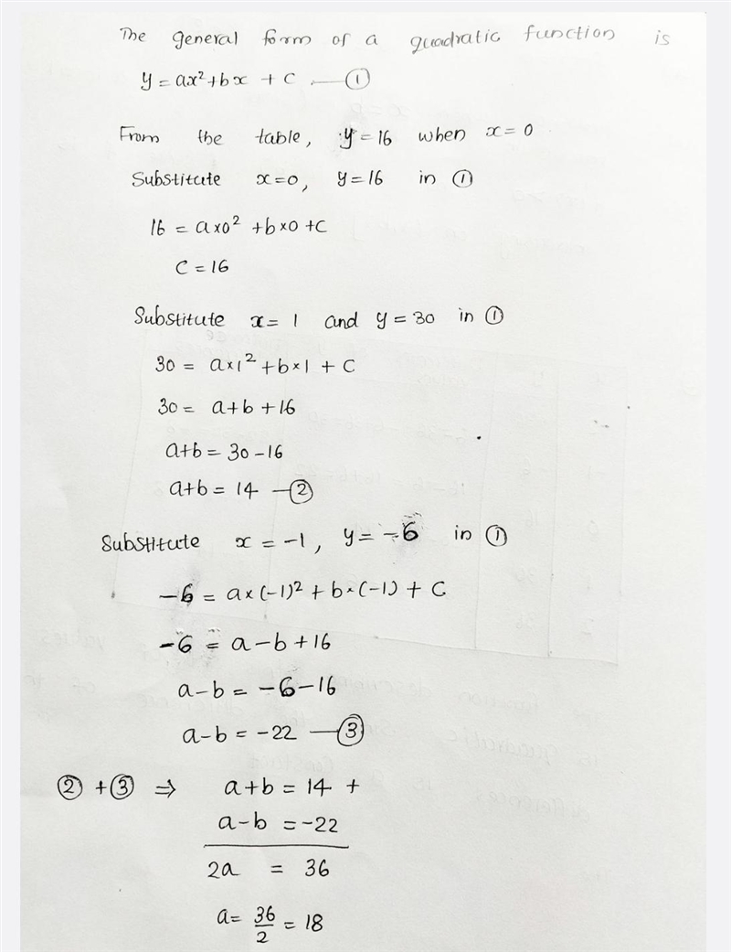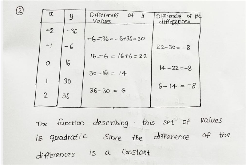 First we find the difference of y values. Then Find the difference of the differences. If the difference of the differences is a constant then the data represents a quadratic function.