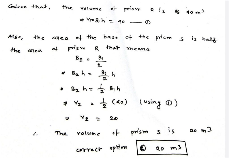 The volume of prism R is 40 m³. Prism R and prism S have the same height. The area of the base of prism S is half the area of the base of prism R. What is the volume of prism S? 1) 10 m³ 2) 20 m³ 3) 40 m³ 4) 80 m³