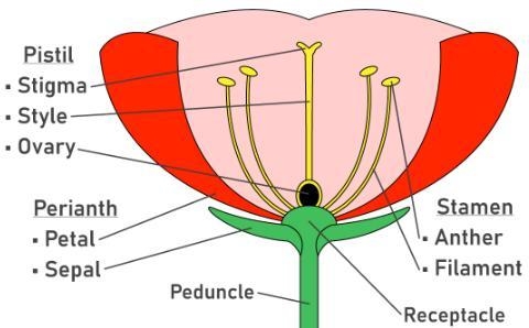 Match the following parts of a flower with their descriptions. 1. pistil female part of the flower 2. stamen makes pollen 3. sepal attaches the flower to the stem 4. receptacle protects the ovary 5. petals