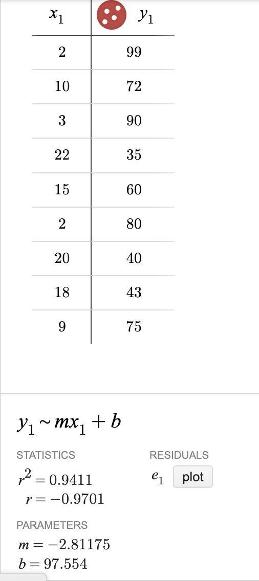 a) y = -2.812x + 97.554