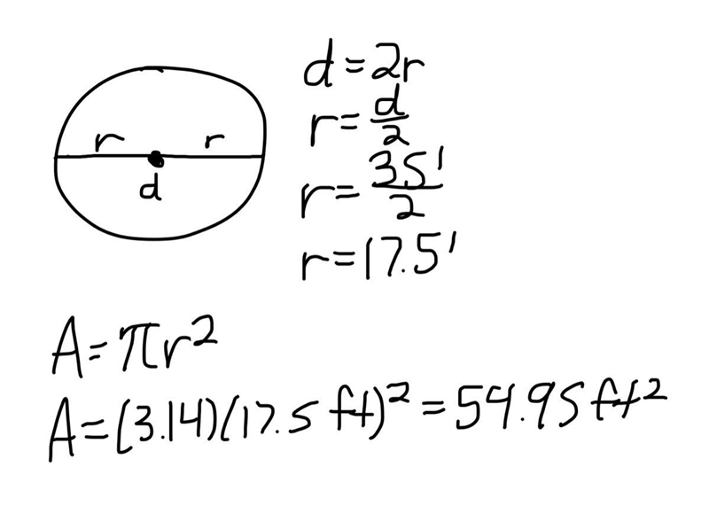 The diameter of a circle is twice it's radius, so simply divide the diameter by two. Then, plug in your newfound radius into the area of a circle while using pi as 3.14.