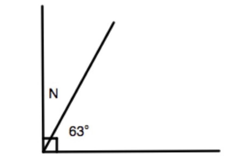 Since the larger angle is a right angle, it would total to 90 degrees. Subtract 63 degrees from this number to get the value of N.