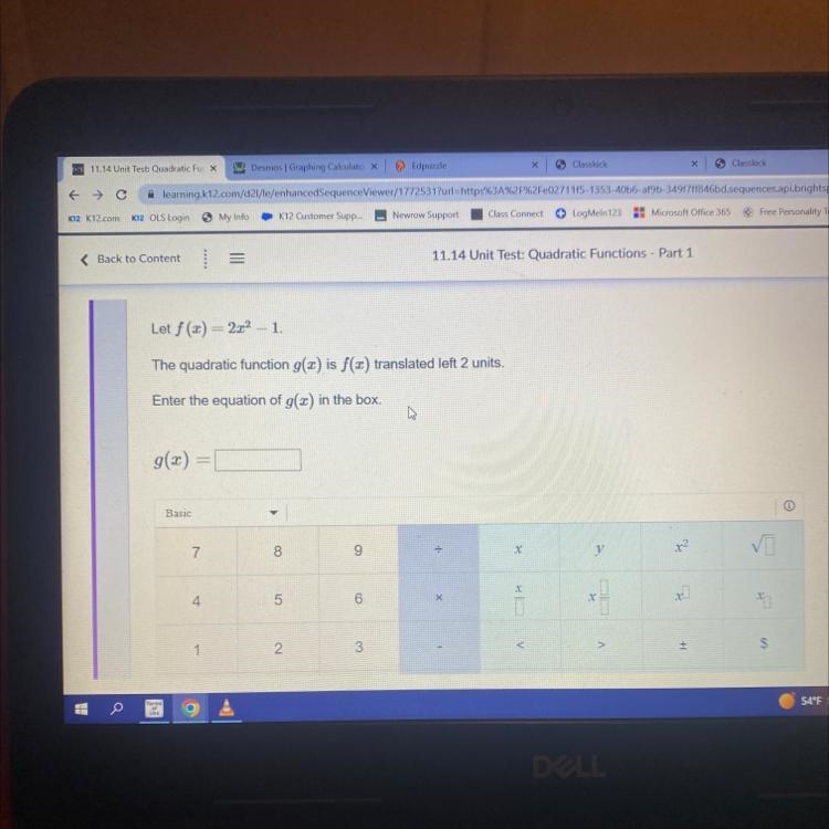 Let f(x) = 2x² – 1. - The quadratic function g(x) is f(x) translated left 2 units. Enter the equation of g(x) in the box. g(x) =