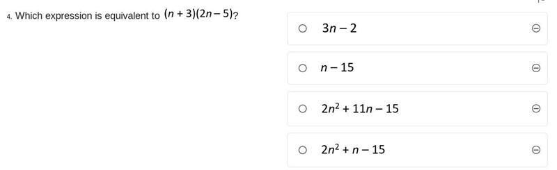 Which expression is equivalent to ( n + 3) (2n - 5)?