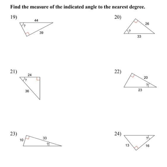 Since these are all right triangles, you can use sin, cos, and tan functions to find angles.