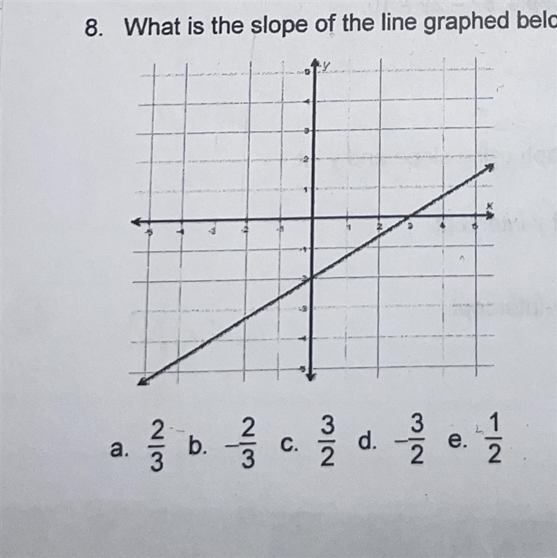 What is the slope of the line graphed below? A. 2/3. B. -2/3. C. 3/2. D. -3/2. E. 1/2.