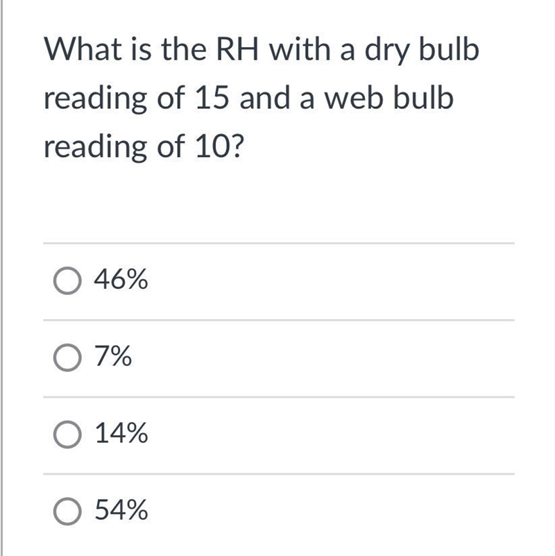 To calculate the relative humidity (RH) with a dry bulb reading of 15 and a wet bulb reading of 10, we need to use a psychrometric chart or formula.