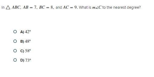 C ≈ 51.96 degreesTherefore, to the nearest degree, m∠C ≈ 52 degrees.