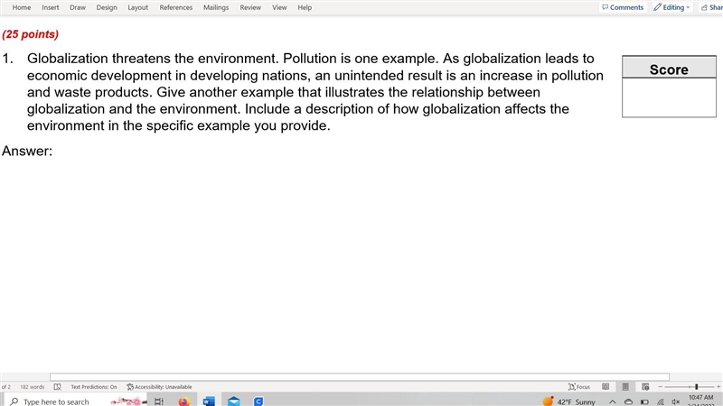 Globalization will effect the environment due to the fact that in order to globalize stuff we need get stuff from the environment, fumes come from the gas cars/machines run on, oil drilling, factory work