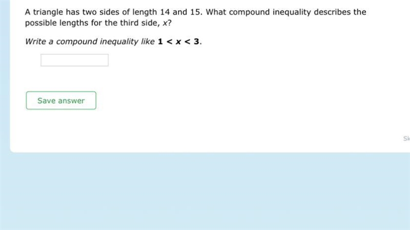 14 + x > 15, so x > 1. 15 + 14 > x, so x < 29.