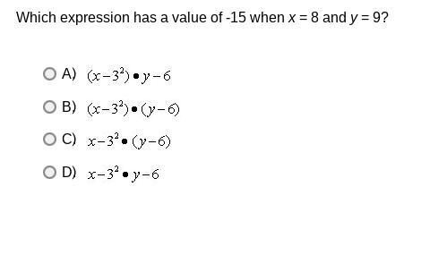 The expression that has a value of -15 when x=8 and y = 9 is (D) x-3²-y-6.