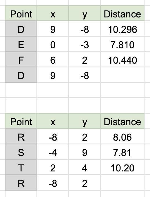 The distances shown in the attached spreadsheet are from each point to the next on the list. The first segments being different is sufficient to show the triangles are not congruent.