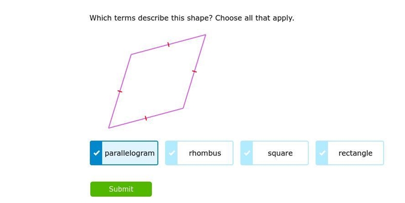 £ 3.9.3 Quiz: Classifying Quadrilaterals XA Which answers describe the shape below? Check all that apply. A. Rhombus B. Trapezoid C. Square D. Parallelogram E. Quadrilateral OF. Rectangle
