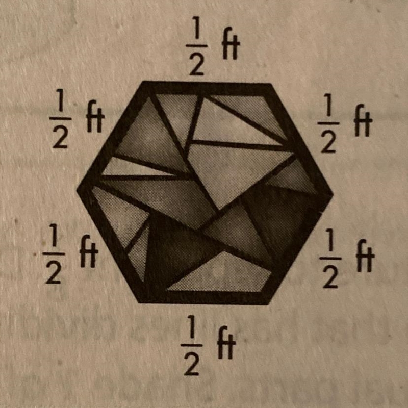14. The stained glass shown here is a hexagon. How can you use multiplication to find its perimeter? 1/2 ft 1/2 ft 1/2 ft 1/2 ft 1/2 ft 1/2 ft