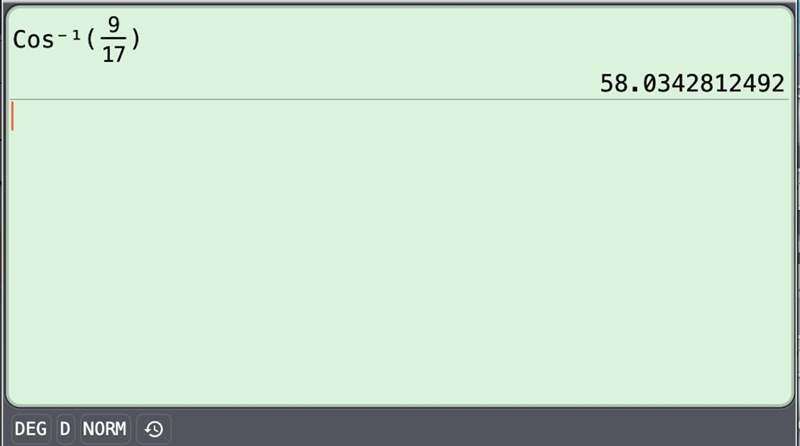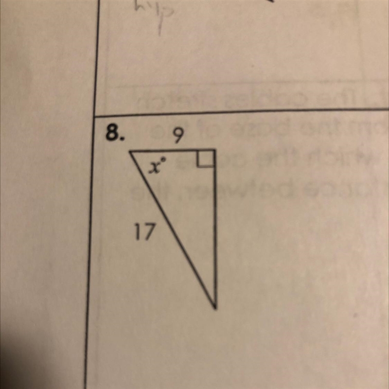 Given a right triangle with an acute angle marked x°, the adjacent side marked 9, and the hypotenuse marked 17, you want the measure of the angle.