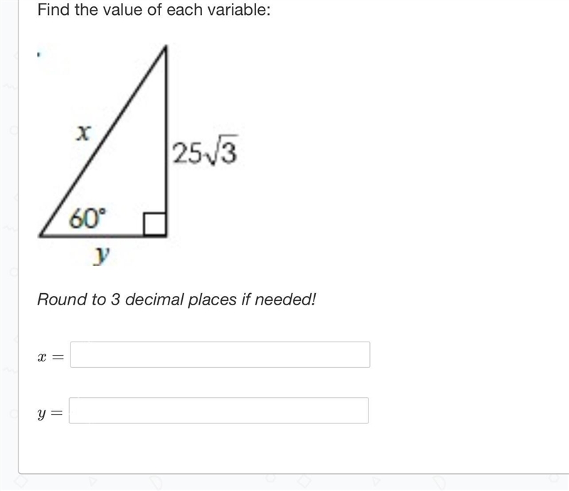 . Sin(60) = 0.866, so your answer is 50.0014667312, or x = 50. Do the same for the other one, just with tan (Opposite over adjacent). Your answer is 25.