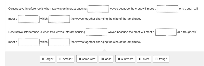 Constructive interference is when two waves interact causing larger waves because the crest will meet a crest or a trough will meet a trough which adds the waves together changing the size of the amplitude.