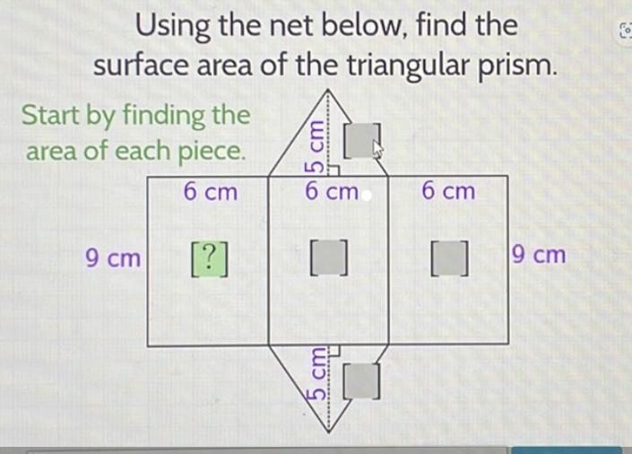 Using the net below, find thesurface area of the triangular prism.Start by finding thearea of each piece.6 cm9 cm[?]576 cmcm6 cm9 cmTo find the surface area of the triangular prism, we need to find the area of each face and add them up. First, let's find the area of the triangular base: Area of triangle = (1/2) x base x height The base of the triangle is 6 cm and the height is 9 cm, so: Area of triangle = (1/2) x 6 cm x 9 cm = 27 cm^2 Next, let's find the area of each rectangular face: Area of rectangle = length x width One rectangular face has a length of 9 cm and a width of 6 cm: Area of rectangular face = 9 cm x 6 cm = 54 cm^2 The other rectangular face also has a length of 9 cm and a width of 6 cm: Area of rectangular face