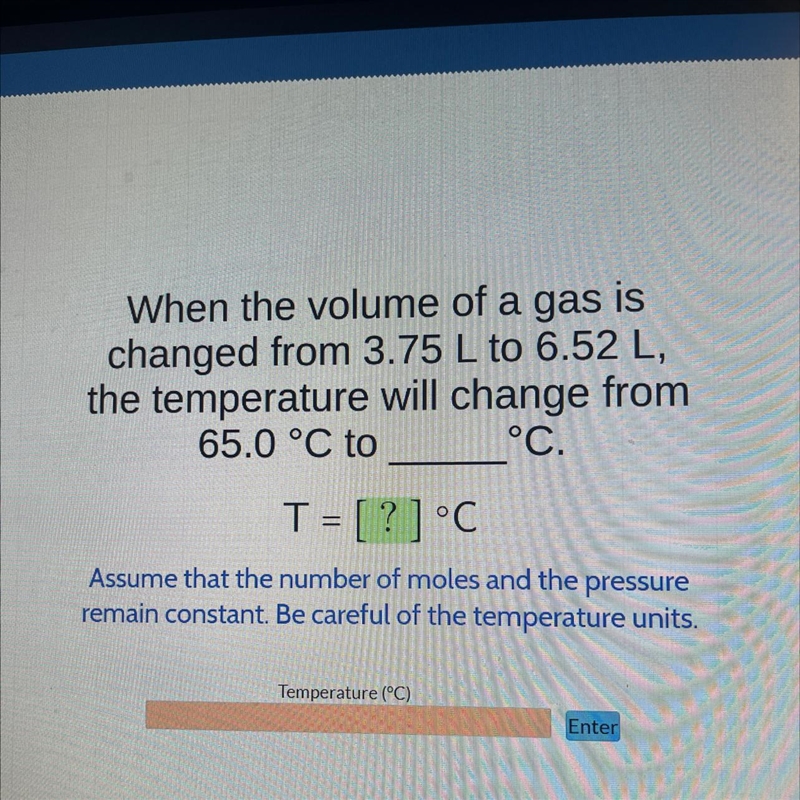 When the volume of a gas is changed from 3.75 L to 6.52 L, the temperature will change-example-1