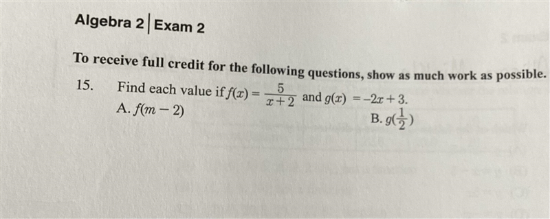 100 Points!!! Find each value if f(x)=5/x+2 and g(x)=-2x+3. Photo attached. Looking for an answer to A and B. Thank you!