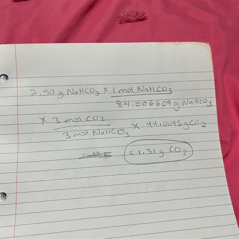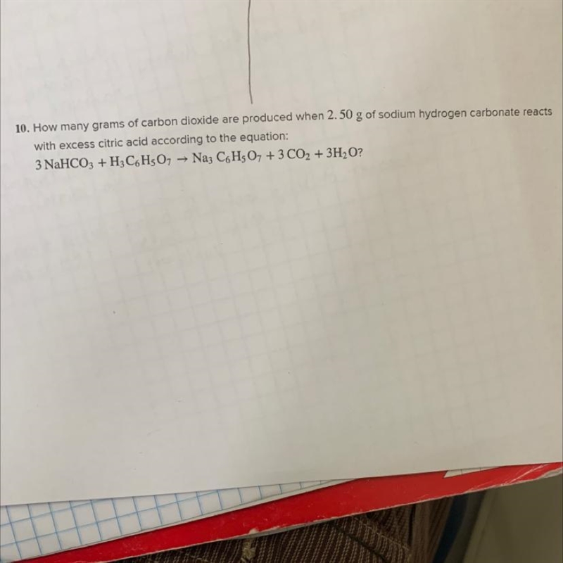 10. How many grams of carbon dioxide are produced when 2. 50 g of sodium hydrogen carbonate reacts with excess citric acid according to the equation: 3 NaHCO3 + H3 C6H5O7 → Na3 …