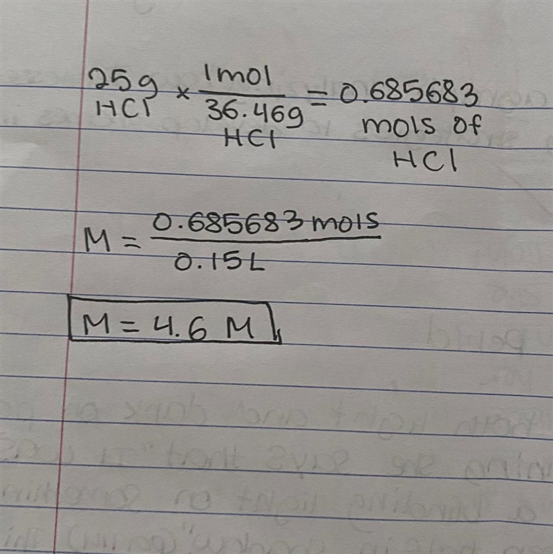 What is the molarity of a solution that contains 25 g of HCl in 150 mL of solution? (The molar mass of HCl is 36.46 g/mol.) What should you find first?