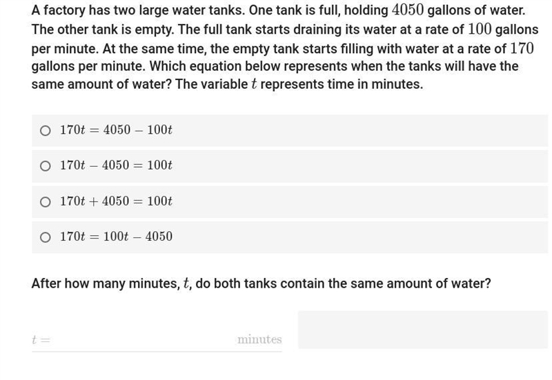I believe that the correct answer would be A) 170t = 4050 - 100t