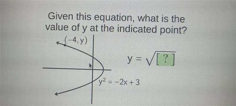 Given this equation what is the value of y at the indicated point? (-4,y) y^2=-2x+3​