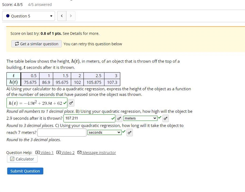 7 m = - 4.9t^2 + 29.8t + 62 <====solve for 't'