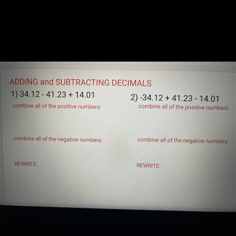 Adding and subtracting decimals 1) 34.12 - 41.23 + 14.01 2) -34.12 + 41.23 - 14.01 Combine all positive numbers: Combine all negative numbers: Rewrite: (look at the picture)