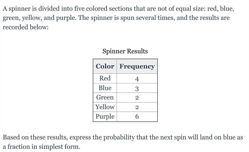 Step-by-step explanation: 17 spins and 3 are blue so 3/17 is the probability written as a fraction in it's simplest form