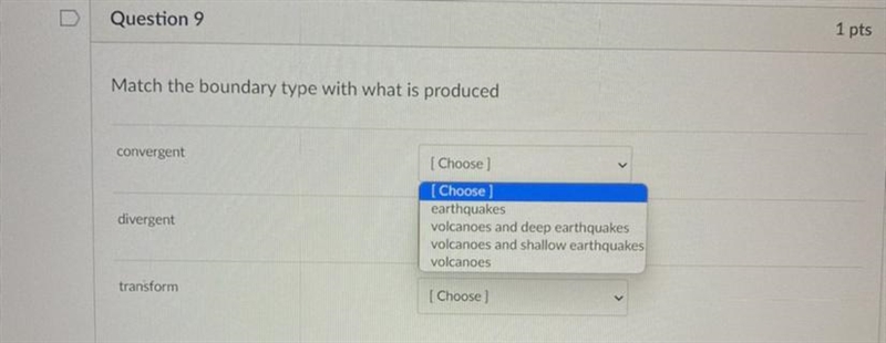 Number 1. Convergent boundaries typically produce volcanoes and deep earthquakes. Number 2. The boundary type that matches the first two options (volcanoes and deep earthquakes, volcanoes and shallow earthquakes) is the divergent boundary, where tectonic plates move away from each other. The third option (just volcanoes) could be a result of either a convergent boundary (where tectonic plates collide) or a hotspot (a plume of hot magma rising from the mantle). Number 3. Volcanoes