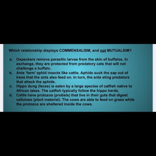 Which relationship displays COMMENSALISM, and not MUTUALSIM? a. Oxpeckers remove parasitic larvae from the skin of buffalos. In exchange, they are protected from predatory cats that will not challenge