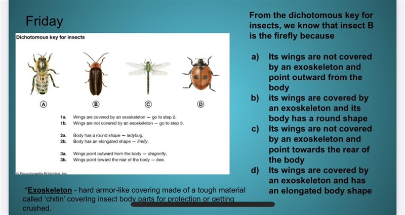 From the dichotomous key for insects, we know that insect B is the firefly because