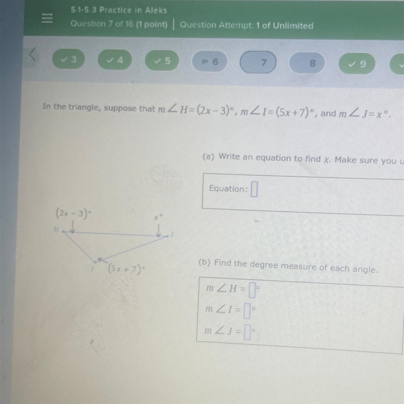 (2x - 3) + (5x + 7) + x = 180 (substituting given angle measures)